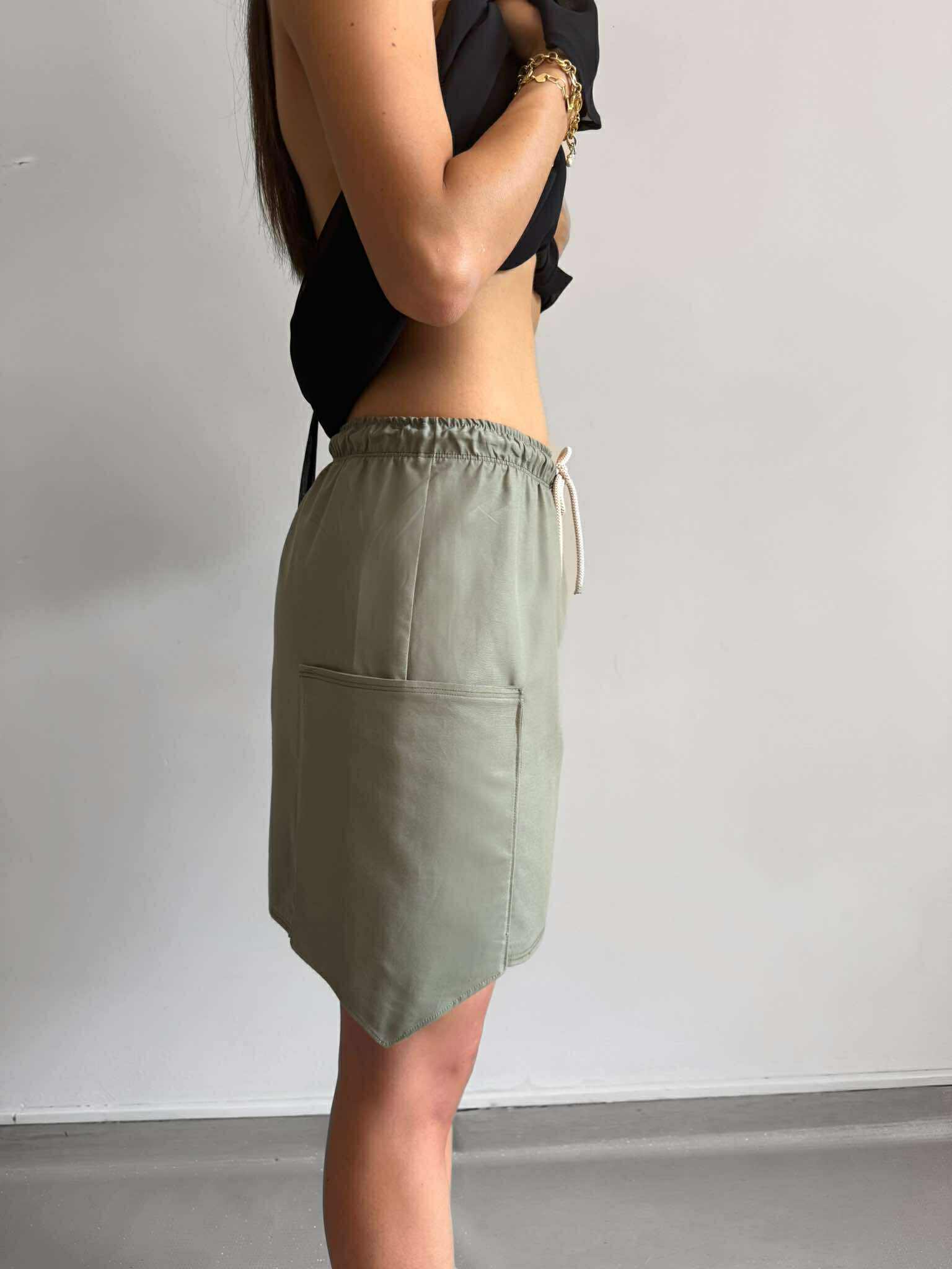 Ph. Cargo mini skirt in military green cotton, beige rope.