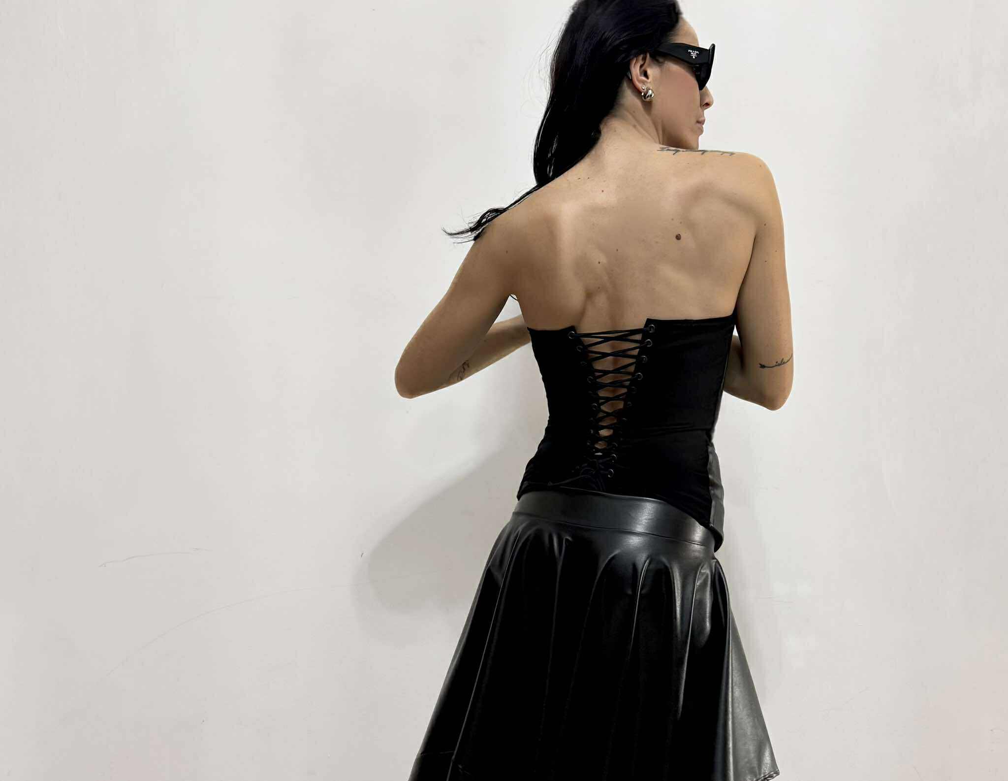 Corset in eco-leather in black cream and burgundy and match transparent micro net at the back.