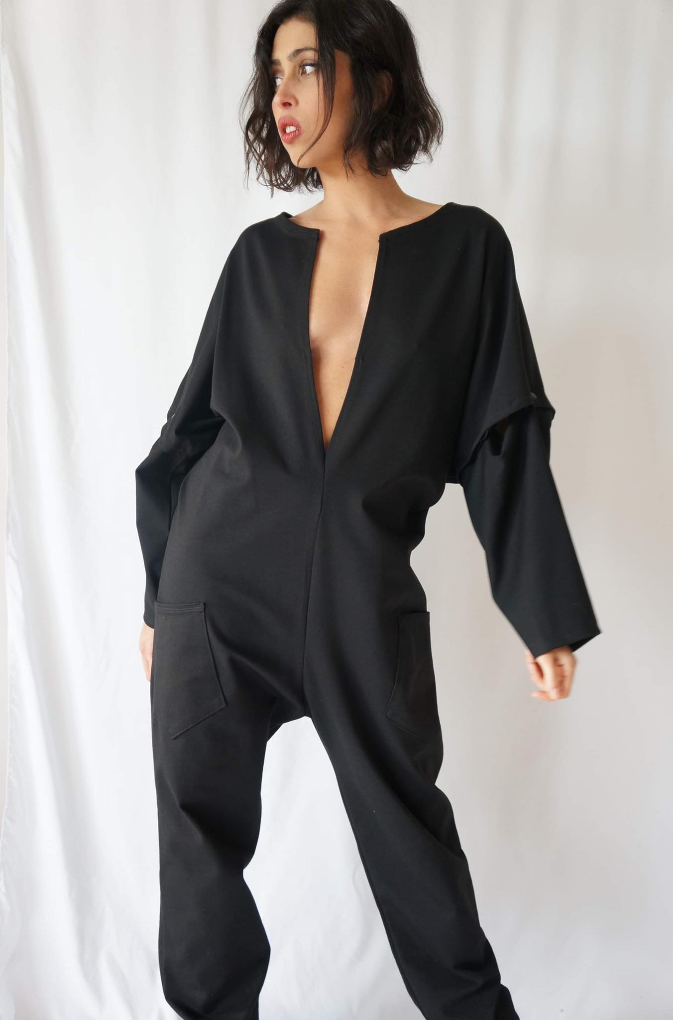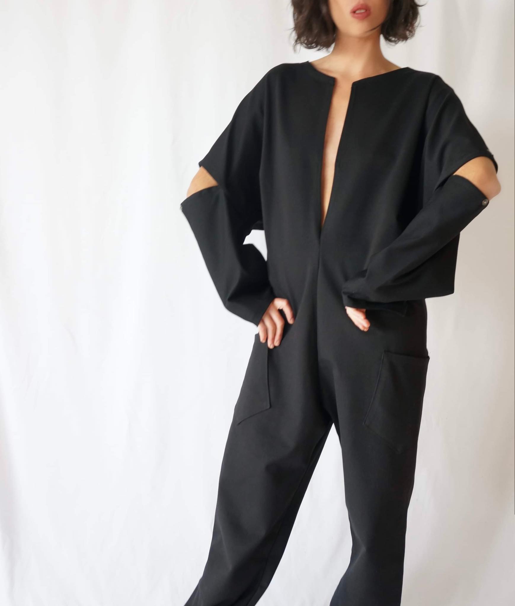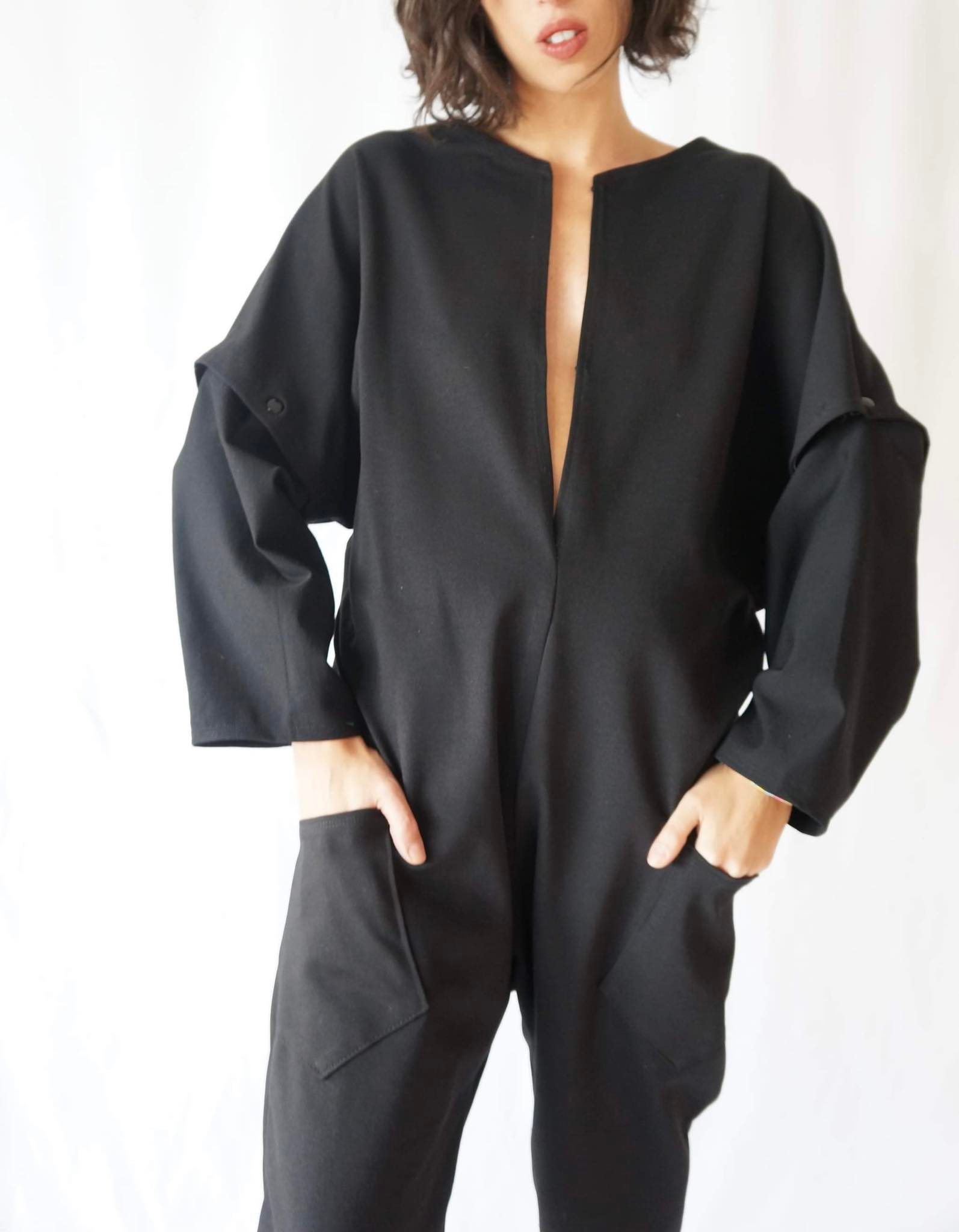 Casual jumpsuit with two pockets and two metal hooks on the V neck side